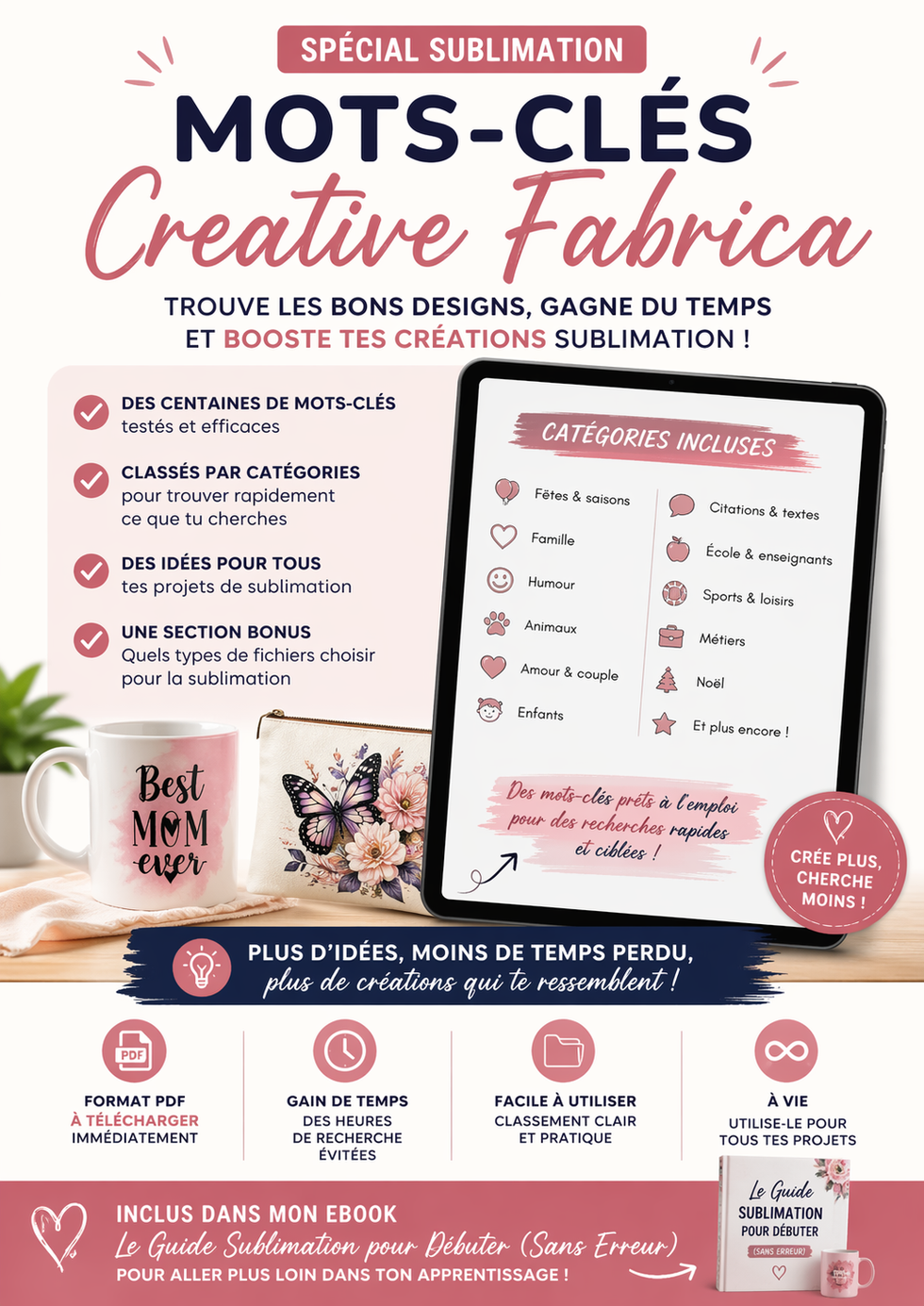 J’ai regroupé pour toi une liste complète de mots-clés Creative Fabrica avec accès direct, spécialement pensés pour la sublimation, afin de t’aider à :
